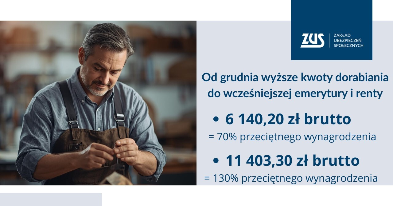 Limity zarobków, które można uzyskać podczas dodatkowego zatrudnienia, zmieniają się co trzy miesiące. Od grudnia 2025 roku do lutego 2026 roku granicą bezpiecznego dorabiania jest kwota 6 140,20 zł brutto, czyli 70 procent przeciętnego miesięcznego wynagrodzenia. Miesięczne zarobki nieprzekraczające tej kwoty nie spowodują zmniejszenia wypłacanej przez ZUS emerytury lub renty. Aby Zakład nie wstrzymał wypłaty świadczenia, dodatkowy miesięczny przychód w grudniu 2025 roku, oraz styczniu i lutym 2026 roku nie powinien przekroczyć 130 procent przeciętnego wynagrodzenia, co odpowiada kwocie 11 403,30 zł brutto - informuje Krystyna Michałek, regionalna rzeczniczka prasowa ZUS w województwie kujawsko-pomorskim.